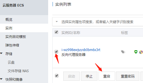 紧接着回到实例列表,勾选实例并点重启按钮,这一步可能会要求短信验证码验证