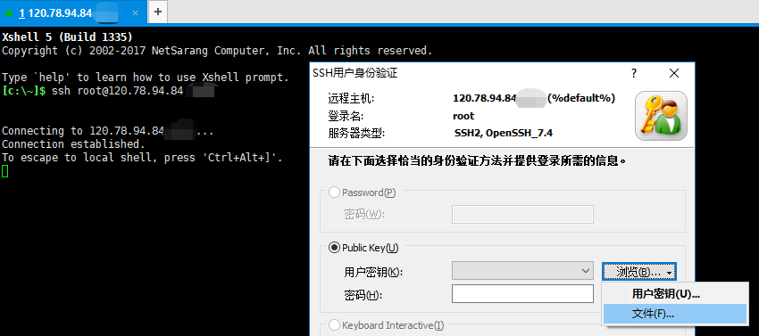 此时应该会弹出“SSH用户身份验证”框,点浏览按钮找到你之前现在的pem文件即可