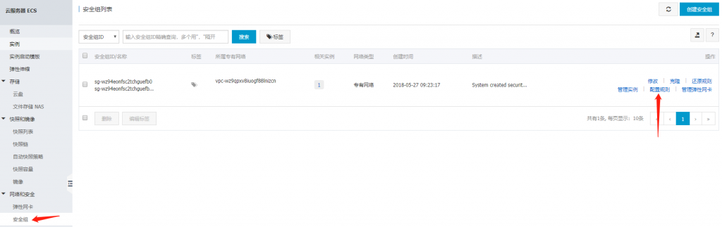 回到云服务器管理控制台,点击“安全组”子页面,点击配置规则