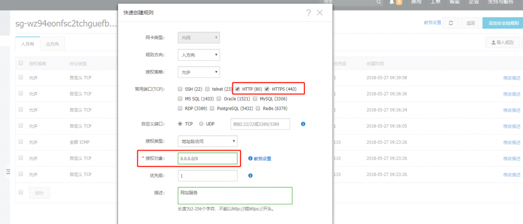 像下图一样添加80端口和443端口的规则,0.0.0.0/0指所有IP(点这学习),简单的理解,安全组就是服务器的防火墙。