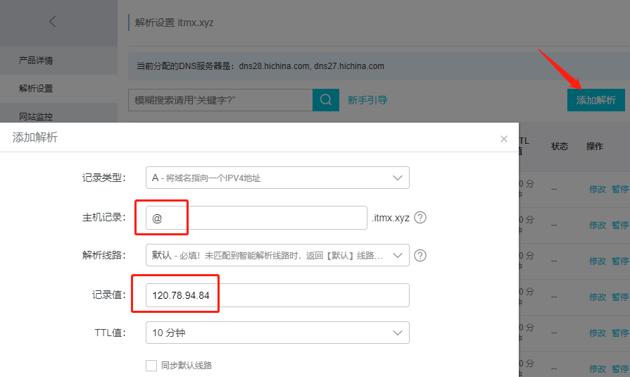 @表示直接解析一级域名itmx.xyz到IP地址120.78.94.84