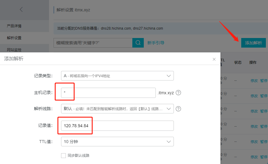 *表示解析所有二级域名(如a.itmx.xyz,b.itmx.xyz等)到IP地址120.78.94.84