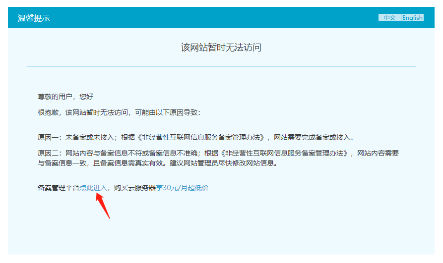 根据《非经营性互联网信息服务备案管理办法》,网站需要完成备案或接入,所以如果出现该页面,建议进入阿里云备案系统(https://beian.aliyun.com)根据要求进行网站备案。阿里云通过拦截80端口的http请求头Host字段检查域名是否备案,为了测试我们网站的配置是否正确,我们可以暂时通过443端口使用HTTPS访问我们的博客。