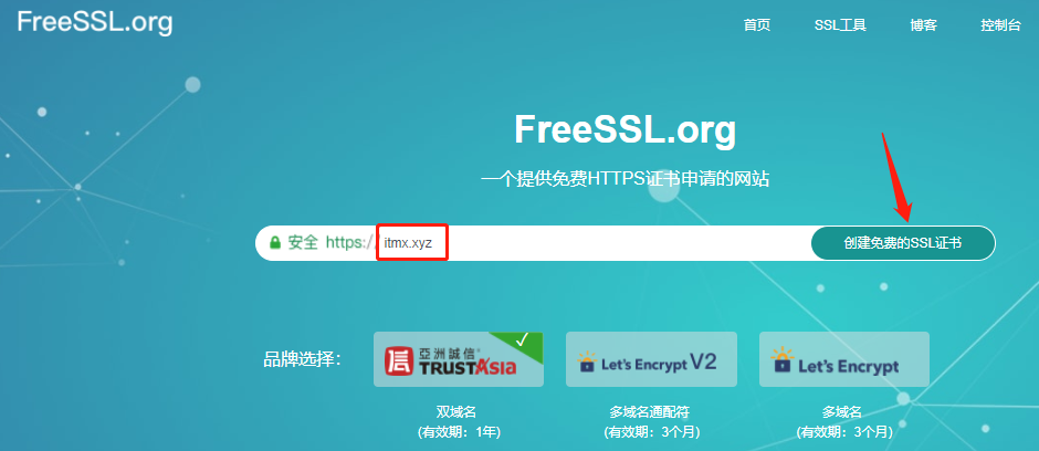 首先我们打开https://freessl.org ,输入我们的域名,点击“创建免费的SSL证书”按钮