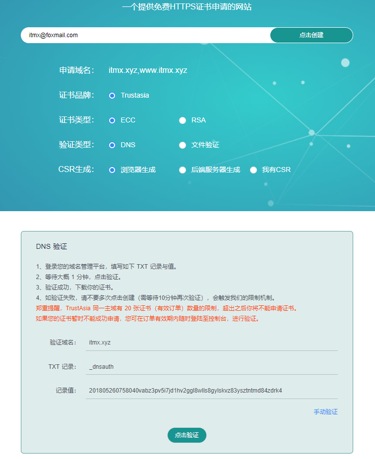 第二步,输入你的邮箱,然后点击创建,得到如下页面