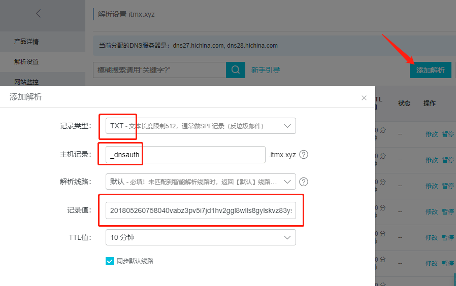 为了证明这个域名是你的,你需要添加一条TXT解析记录,打开DNS域名解析页面(https://dc.console.aliyun.com/dns),如下图填写上图的数据