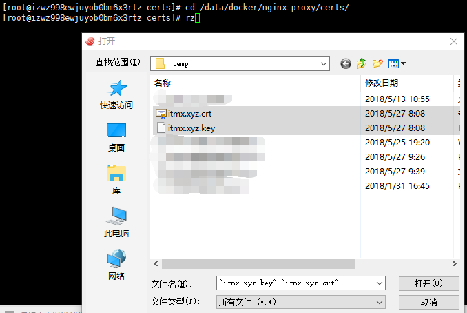 //传输文件到当前文件夹,选择itmx.xyz.crt和itmx.xyz.key即可