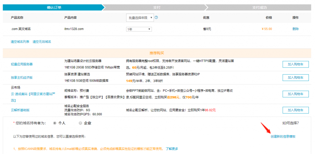 接着调到确认订单页,新用户会提示“创建新的信息模板”