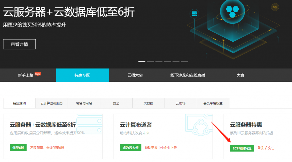 打开阿里云首页(https://www.aliyun.com),点最新活动,找到“云服务器特惠”