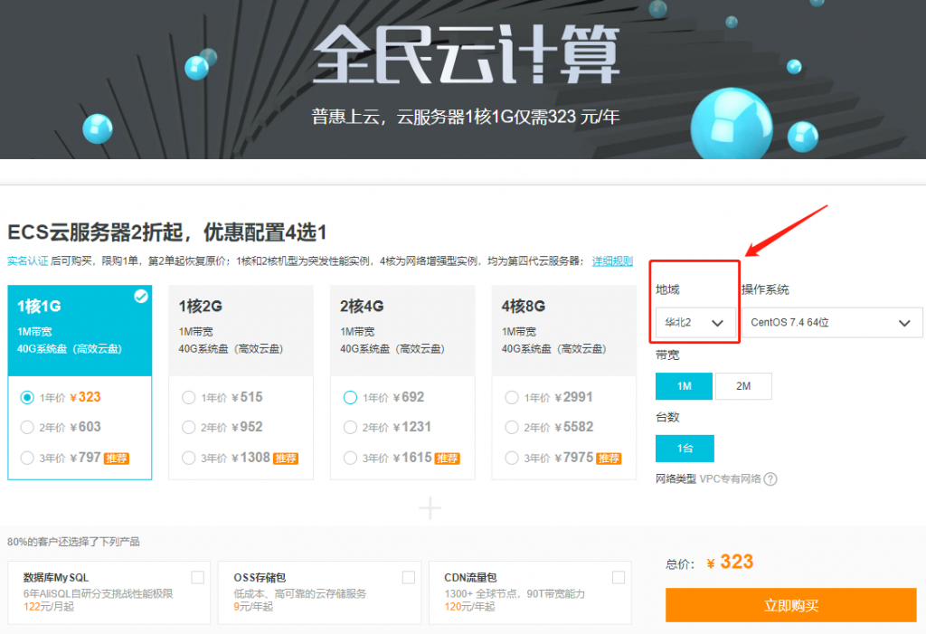 然后进入配置选择页面,选择自己想要的配置,根据自己的预算选择。注意选择合适的地区,我人在广州,所以我选择华南地域,新购的服务器将创建在华南,当然选别的地区也可以,只是访问延迟会大一丢丢,也不是大很多,如果是用作企业服务,那要看用户集中分布在哪个地区,进而选择。