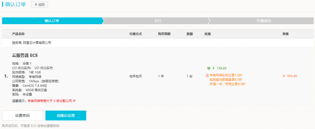 选择好之后,进入确认订单页面,密码选项选择“创建后设置”,勾选《云服务器 ECS 服务条款》,支付即可