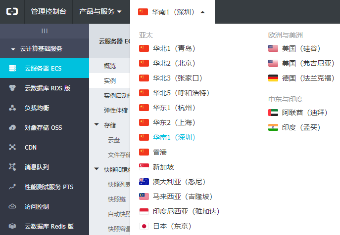 打开“云服务器管理控制台”https://ecs.console.aliyun.com,切换到实例列表,如果实例列表是空的,请选择你购买时相应的地区